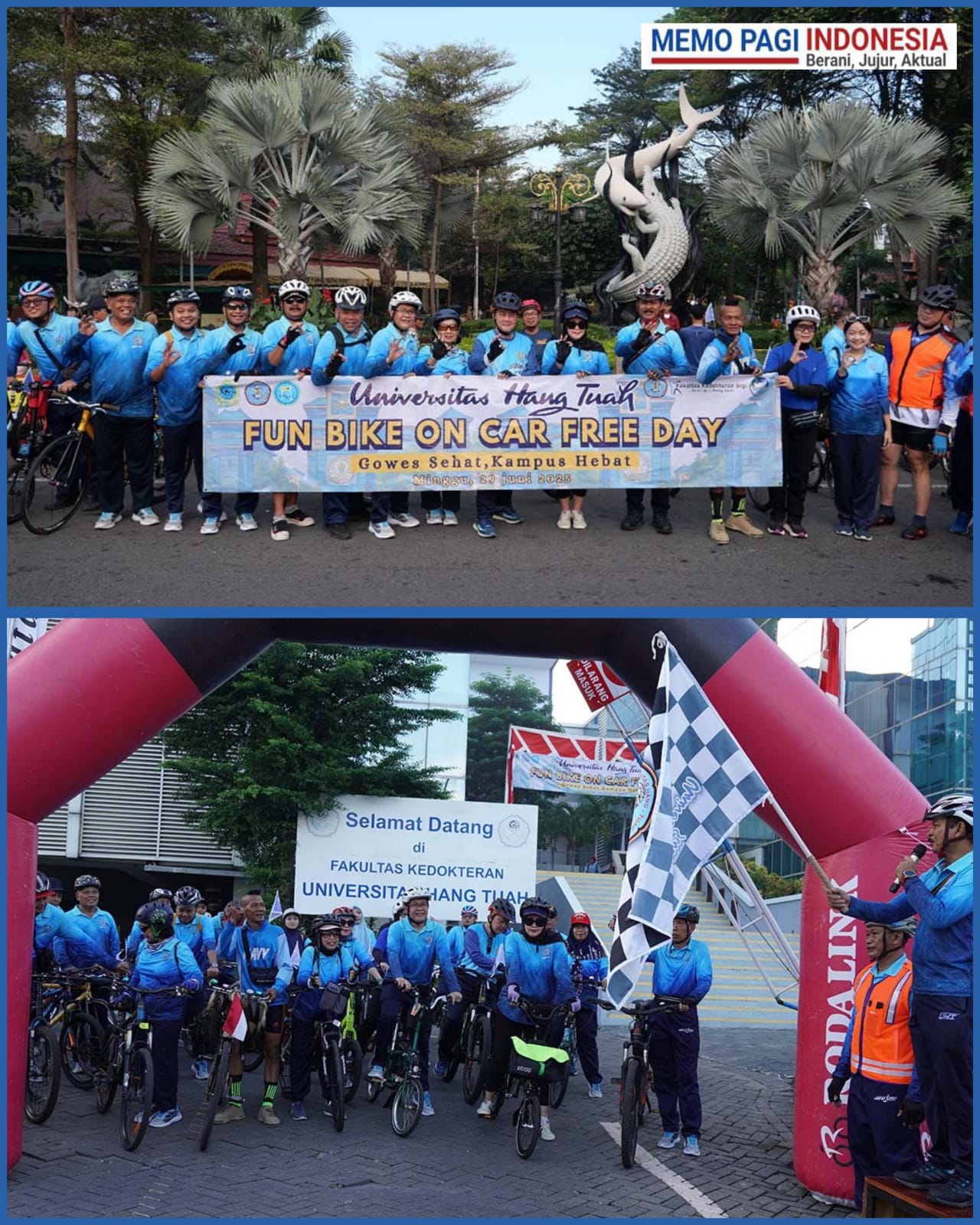 SURABAYA, memo-pagi.com – Minggu 29 Juni 2025, Universitas Hang Tuah (UHT) menggelar kegiatan Fun Bike on Car Free Day yang berlangsung meriah dan penuh semangat di tengah antusiasme masyarakat Kota Surabaya. Kegiatan ini menjadi momentum penting untuk menumbuhkan semangat hidup sehat sekaligus mempererat kebersamaan antara sivitas akademika, alumni, dan masyarakat umum.