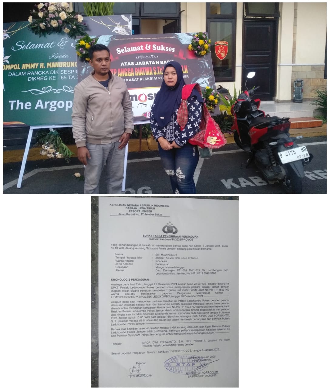 JEMBER, memo-pagi.com – Pada Senin, 6 Januari 2025, seorang perempuan bernama Siti Mawaddah (27) tahun, warga Dusun Darungan, RT 04 RW 13, Desa Lembengan, Kecamatan Ledokombo, Kabupaten Jember, mendatangi Unit Paminal Sipropam Polres Jember.