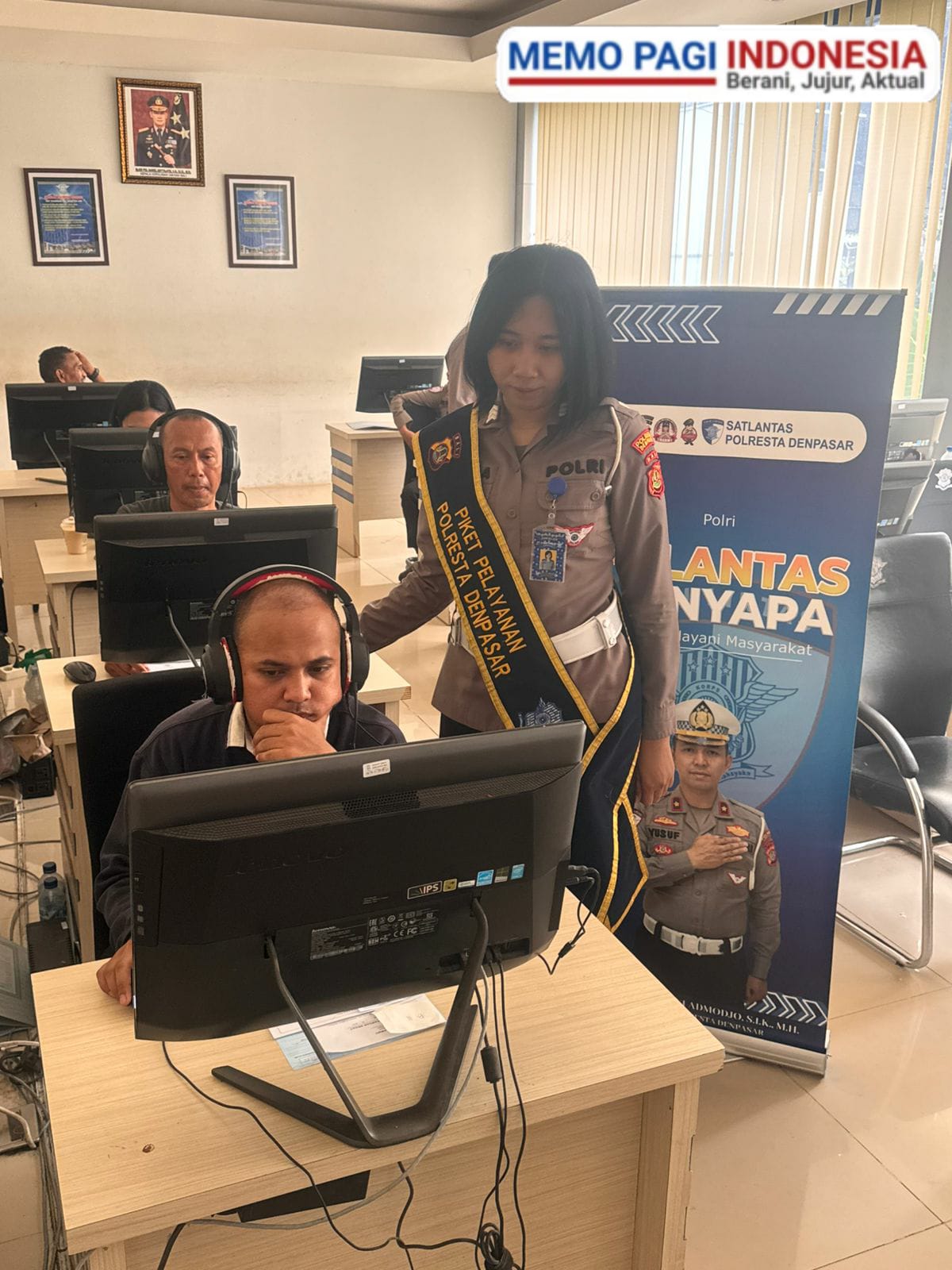 DENPASAR, memo-pagi.com – Suasana pelayanan di Satpas SIM Satlantas Polresta Denpasar tampak tertib dan kondusif. Sejumlah pemohon SIM terlihat mengikuti tahapan ujian teori berbasis komputer dengan serius, didampingi langsung oleh petugas yang sigap memberikan arahan.