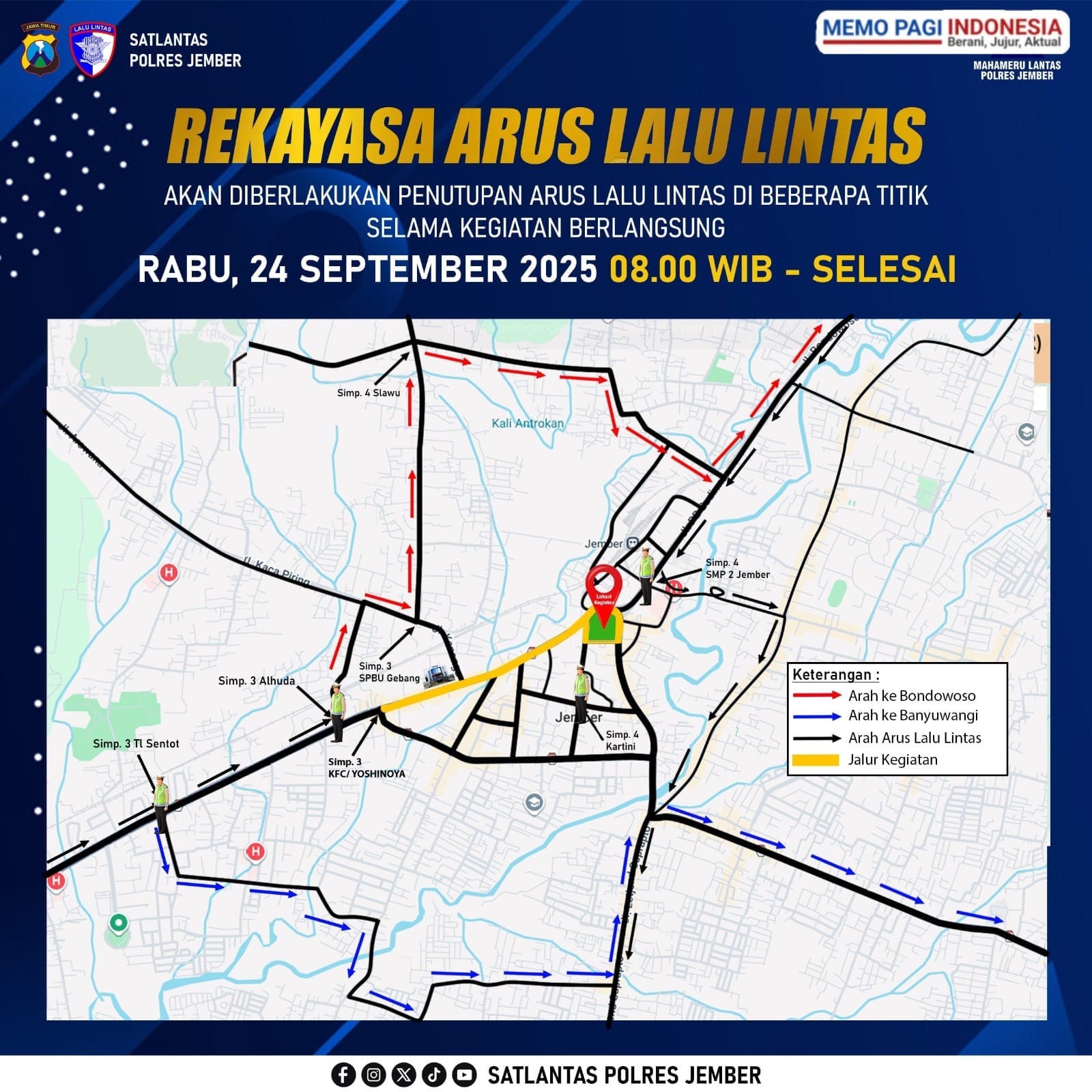 Kapolres Jember, AKBP Bobby A. Condroputra melalui Kasi Humas Ipda M. Zazim, menegaskan bahwa pihak kepolisian bersama instansi terkait sudah menyiapkan rekayasa lalu lintas dan pengamanan ekstra. Hal ini dilakukan supaya acara berjalan tertib, aman, dan tetap nyaman untuk warga.