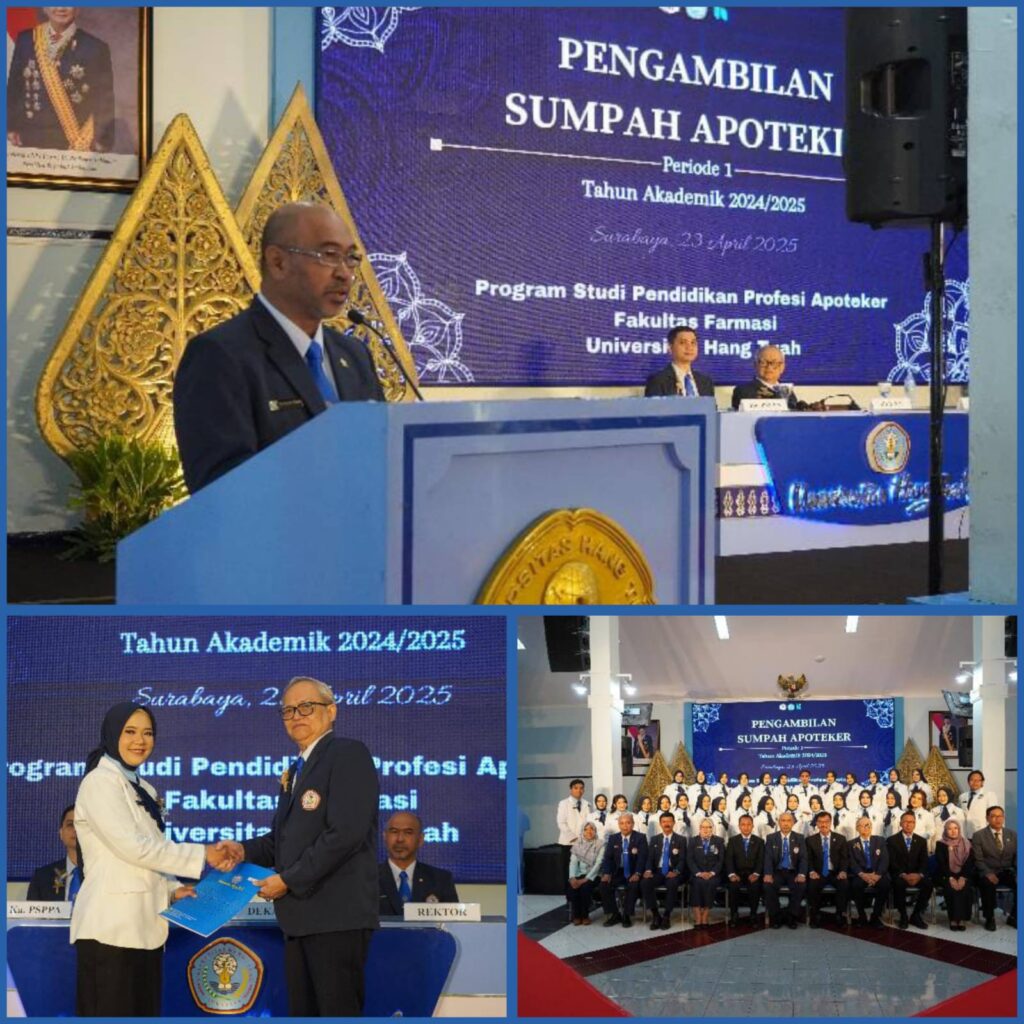 SURABAYA, memo-pagi.com – 23 April 2025, Sebuah momen monumental tercipta di lingkungan Universitas Hang Tuah (UHT), tepatnya di Gedung Serbaguna Kampus Arif Rahman Hakim, ketika Fakultas Farmasi untuk pertama kalinya menyelenggarakan Sumpah Apoteker Perdana bagi 30 lulusan Program Studi Pendidikan Profesi Apoteker. Acara ini menjadi tonggak penting dalam sejarah institusi dan dunia pendidikan kefarmasian di tanah air.